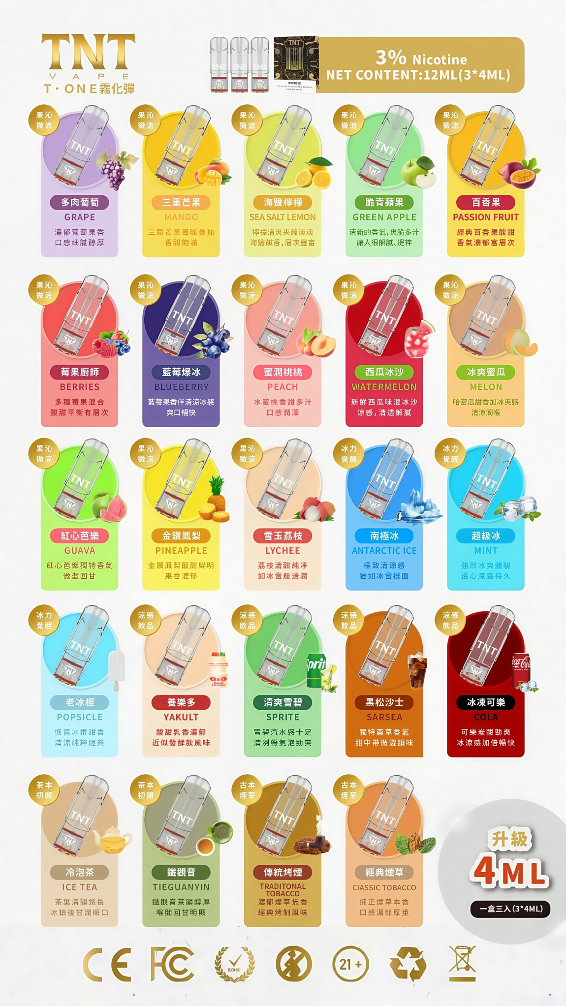 TNT一代煙彈採用4ml大容量設計,一盒三入共12ml,通用一代主機即插即用。陶瓷霧化芯搭配3%尼古丁鹽,口感穩定不嗆喉,多達26種口味可選。立即選購,升級你的日常抽吸體驗。